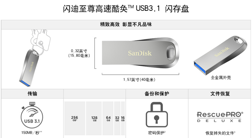 商品名稱:閃迪(SanDisk)USB3.1高速U盤CZ74酷奐銀色金屬外殼USB3.1 閃迪金屬U盤32G