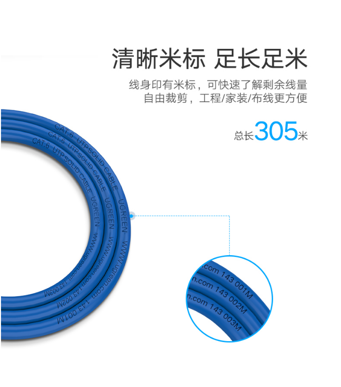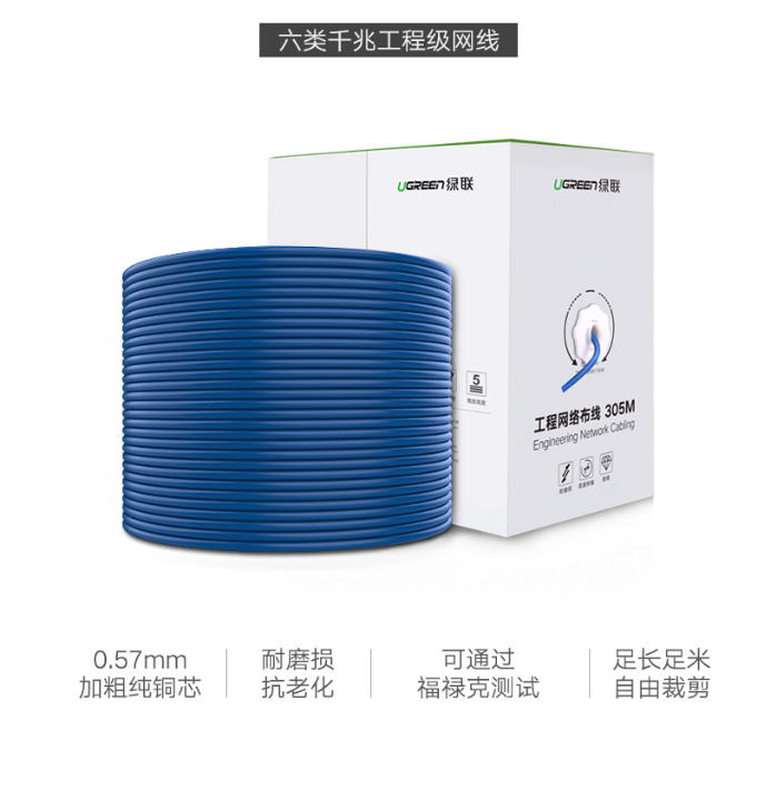 商品名稱:綠聯(lián)(UGREEN)六類網(wǎng)線【工程版0.57mm純銅線芯】CAT6類8芯雙絞千兆網(wǎng)絡箱線 家裝寬帶布線非屏蔽305米11259