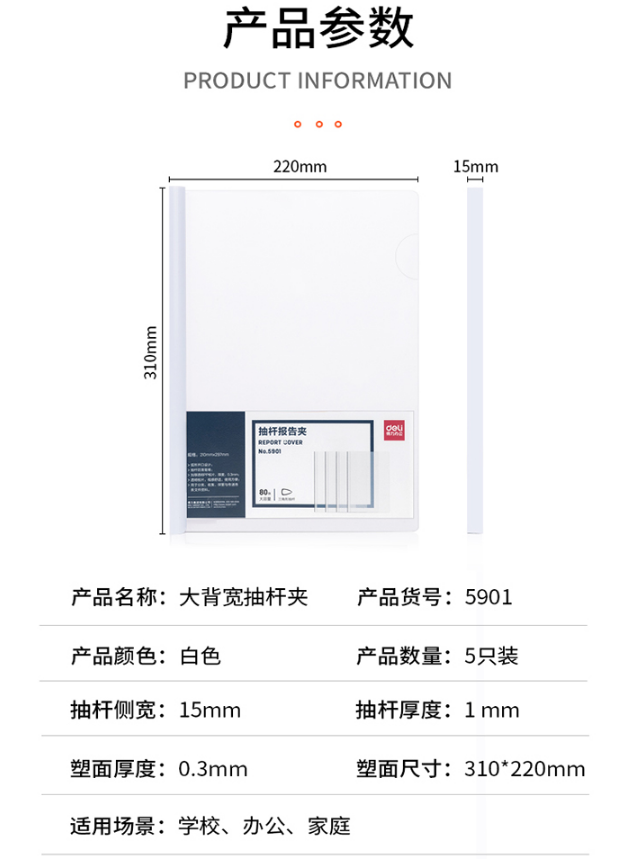 商品名稱:得力(deli)5只A4加寬加厚15mm抽桿夾文件夾 拉桿夾資料簡(jiǎn)歷夾 得力拉桿夾白色5901