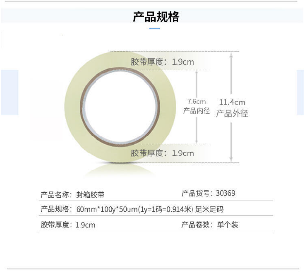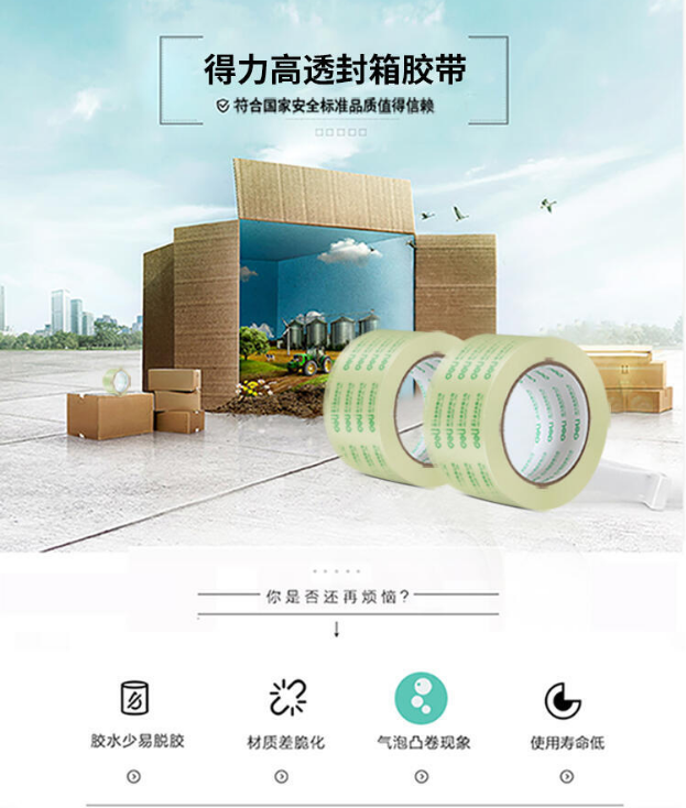 商品名稱(chēng):得力(deli)高品質(zhì)高透明封箱膠帶/打包膠帶 60mm*100y*50um(91.4m/卷) 單卷裝 辦公用品 得力(deli)膠帶30369