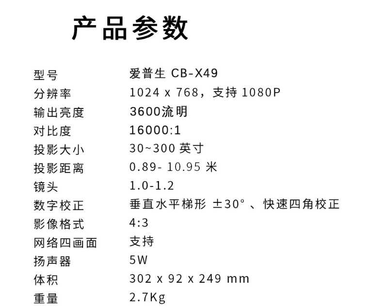 商品名稱:愛普生(EPSON)CB-X49 投影儀辦公掛式 投影機(jī) 商務(wù)投影儀 會議培訓(xùn) (含100英寸4:3電動幕布 白色)愛普生CB-X49 投影儀