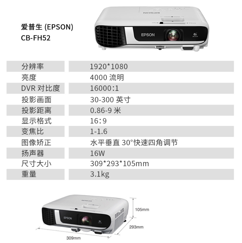 愛普生(EPSON)CB-FH52 投影儀辦公培訓高清 商務(wù)會議高清投影機(含120英寸電動幕布)愛普生CB-FH52投影儀 白色