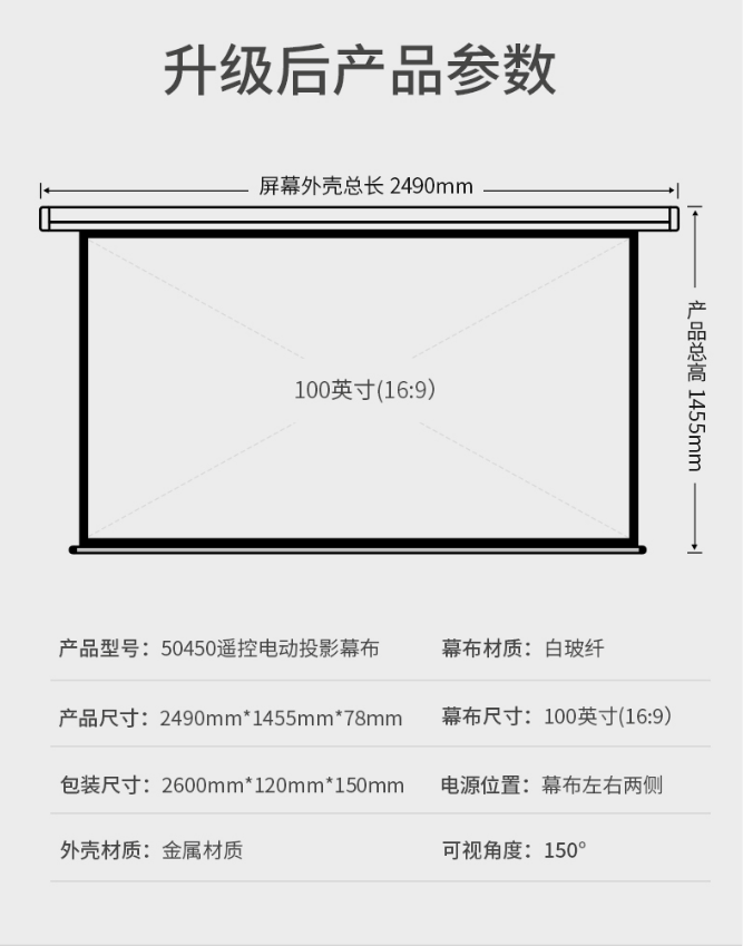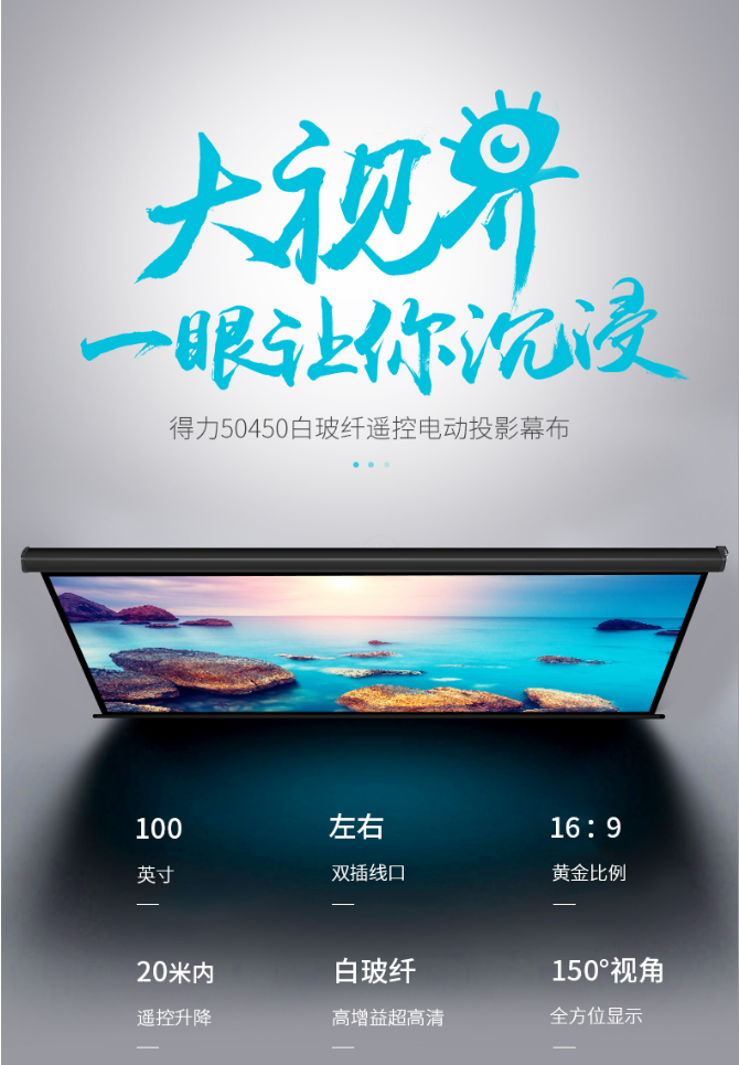 商品名稱:得力(deli)幕布100英寸 16:9 白玻纖遙控電動投影幕布投影布(標配遙控器) 家用投影儀商務(wù)辦公幕布50450