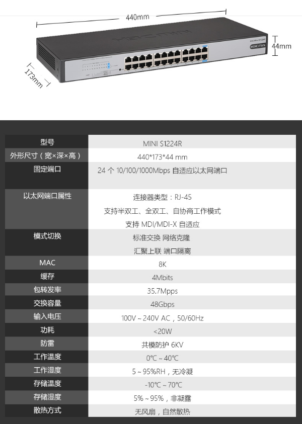 商品名稱:華三 (H3C) 24口全千兆交換機MINI S1224R 可上機架即插即用華三24口千兆交換機MINIS1224R