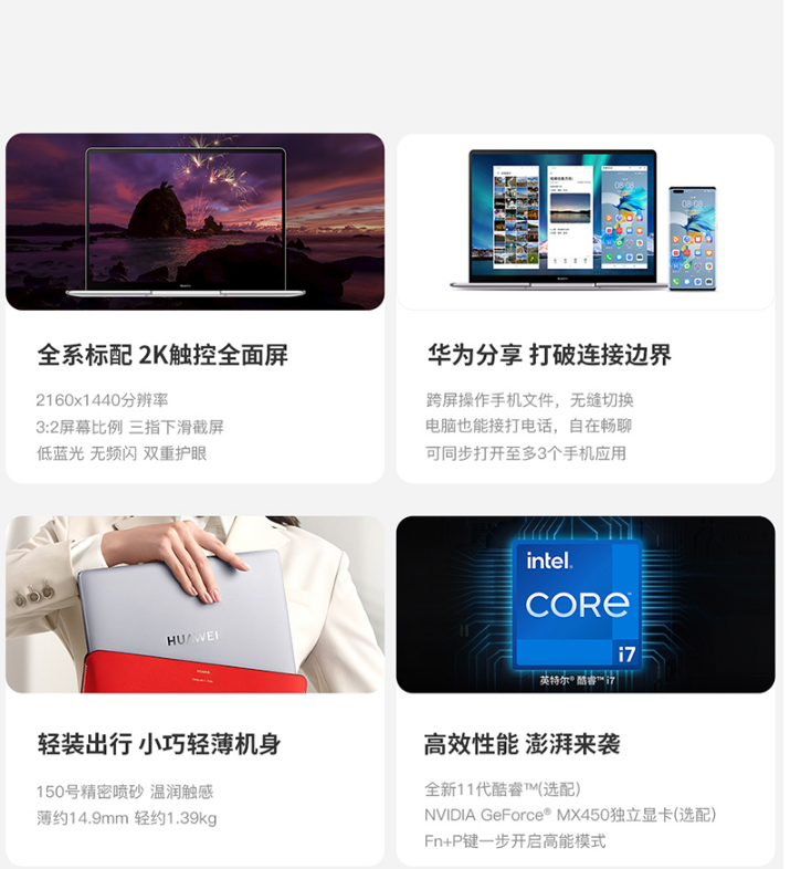 華為(HUAWEI)便攜式計算機MateBook13 超輕薄13英寸筆記本電腦I7-1165G7/16G/512G/MX450獨立顯卡商務(wù)性能筆記本電腦2K全面屏 銀色觸屏