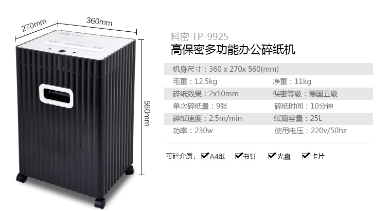 商品名稱:科密(COMET)碎紙機(jī) 顆粒高保密迷你靜音五級(jí)保密商用大容量碎紙粉碎機(jī)25L 5級(jí)黑色 科密碎紙機(jī)TP9925