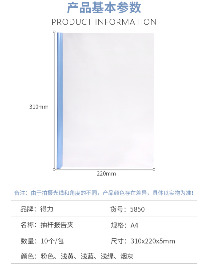 商品名稱:得力(deli)10只A4水滴形拉桿夾抽桿文件夾5mm彩色透明資料夾簡(jiǎn)歷夾 得力拉桿夾5850