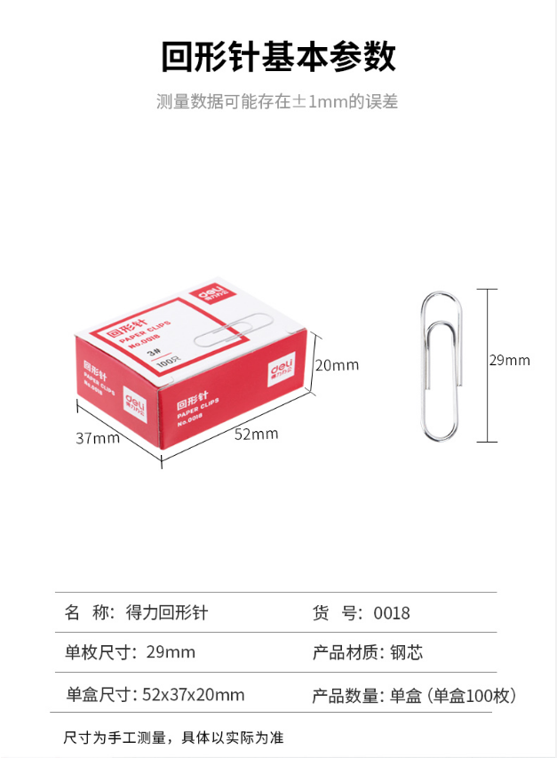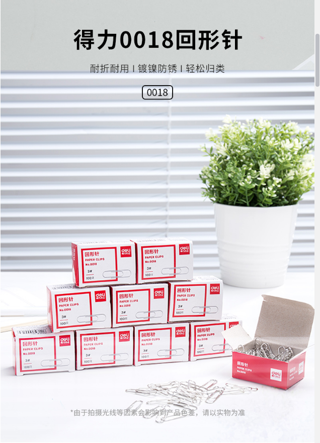 商品名稱:得力(deli) 0018 回形針 曲別針 100枚/盒 得力(deli)曲別針0018