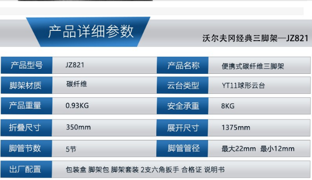 商品名稱:沃爾夫?qū)╓OLFGANG)JZ-821+YT12炭纖維三腳架佳能索尼松下尼康單反微單攝像機(jī)球形云臺(tái)三腳架 炭纖維三腳架沃爾夫?qū)鵍Z-821
