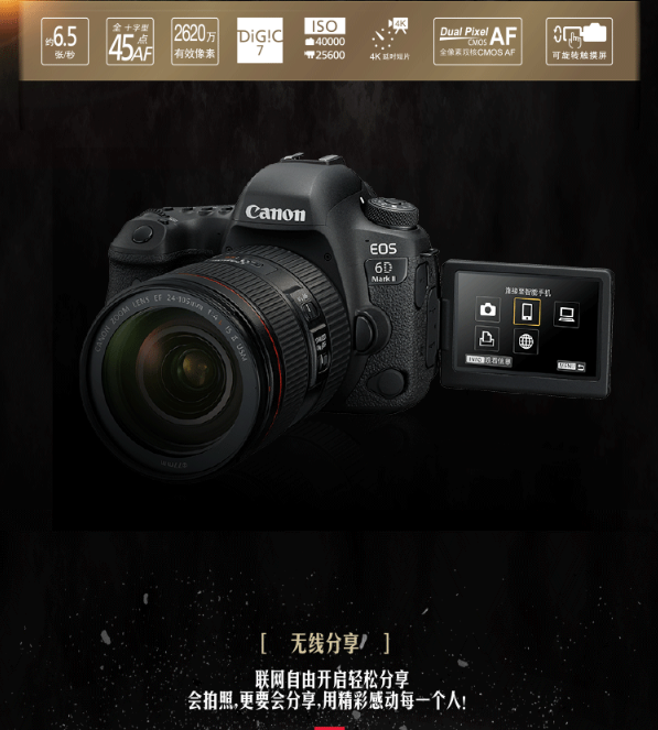 商品名稱:佳能(Canon) EOS6D2Mark II單反相機(jī) 單反套機(jī) 全畫幅(EF 24-105mm f/3.5-5.6 IS STM 單反鏡頭)配件含:相機(jī)包+UV鏡+支架+遮光罩+256G卡*2+閃光燈470EX-AI佳能單反相機(jī) Mark II 6D2
