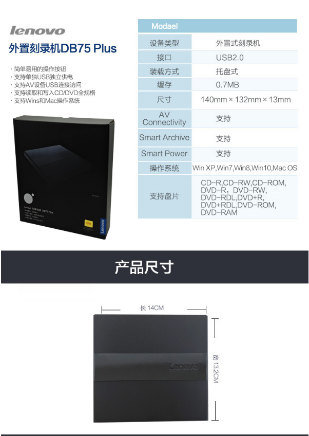 商品名稱:聯(lián)想(Lenovo)8倍速 外置光驅(qū) DVD刻錄機(jī) 移動(dòng)光驅(qū) 聯(lián)想外置光驅(qū)DB75 PLUS 黑色