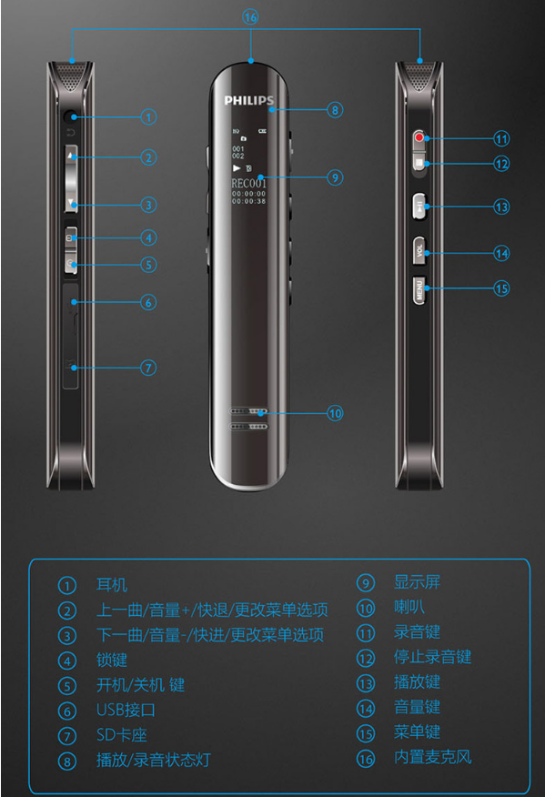 飛利浦(PHILIPS)VTR5210 錄音外圍設(shè)備 錄音筆 16G內(nèi)存可擴(kuò)展 會(huì)議采訪 數(shù)字降噪 雙麥克風(fēng)數(shù)碼鋰電錄音筆